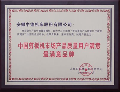 由人民日?qǐng)?bào)社市場(chǎng)信息中心主辦、中國(guó)物流與采購(gòu)聯(lián)合會(huì)、中國(guó)紡織工業(yè)協(xié)會(huì)、中國(guó)輕工機(jī)械協(xié)會(huì)等60多家權(quán)威行業(yè)協(xié)會(huì)、《工人日?qǐng)?bào)》、《科技日?qǐng)?bào)》等10家權(quán)威報(bào)刊、人民網(wǎng)及搜狐網(wǎng)等權(quán)威網(wǎng)站協(xié)辦支持,為期三個(gè)多月的“中國(guó)市場(chǎng)質(zhì)量用戶(hù)滿(mǎn)意度調(diào)查”大型公益活動(dòng)終于揭曉。我公司生產(chǎn)的中德牌剪板機(jī),在本次公益活動(dòng)中,投票人數(shù)多,用戶(hù)評(píng)分高,被用戶(hù)推選為:中國(guó)剪板機(jī)市場(chǎng)產(chǎn)品質(zhì)量用戶(hù)滿(mǎn)意最滿(mǎn)意品牌。