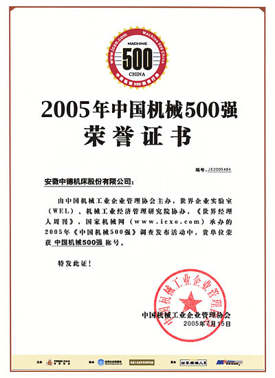7月15日,2005年《中國機械500強》在北京人民大會堂隆重發(fā)布。其中一汽、上汽、中國兵器裝備集團公司等50家上榜企業(yè)同時入選2005《世界機械500大》。此次活動是由中國機械工業(yè)企業(yè)管理協(xié)會主辦,世界企業(yè)實驗室、機械工業(yè)經(jīng)濟管理研究院協(xié)辦,世界經(jīng)理人周刊和國家機械網(wǎng)聯(lián)合承辦的。此次評選中,金屬加工機械制造行業(yè)有19個企業(yè)入選;安徽省共有16個企業(yè)入選;馬鞍山市入選的有2家企業(yè)(除我公司外,還有星馬汽車股份有限公司進入了500強企業(yè));在500強企業(yè)中我公司位列第484位。